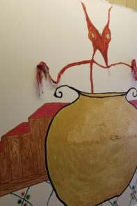 I am using acrylic on canvas and other found objects to paint the painting. It will be framed by the small drawings of various kettles. At the moment, the drawings are hanging in front of the painting assort of a curtain, to be removed when I get back down to work on my project. I live too far away to be able to come daily as planned. Last summer, when I wrote the proposal, I didn't count on having a full-time job, but I got one and can't leave it. So, I will wait until June 16 to start painting again and I won't stop until it's July 15. I urge anyone who is interested to stop by and visit me as I paint. Also, there is an audience participation piece. I am asking the public "What does Melting Pot mean to you?" These answers will be used in the painting somehow. I have ideas but not certain until I see what I get.