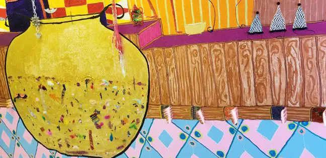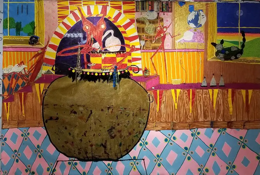 This painting, Melting Pot, began because of our current political leaders demonizing anyone who is in this country and not white. It's sheer bigotry. But I really didn't want to make a direct political statement on a painting. So here stands the alchemist, mixing his cauldron, which will be holding bits and pieces. His goal is to have universal harmony, make gold metaphorically. Alchemy.