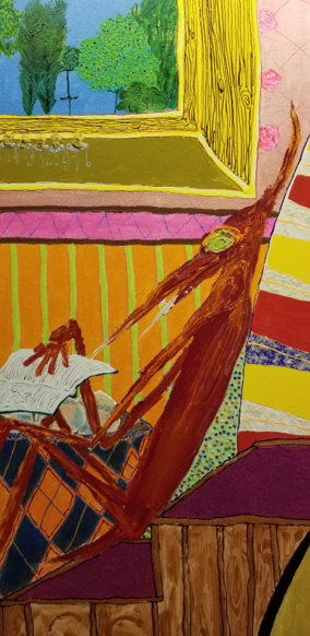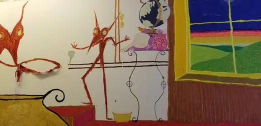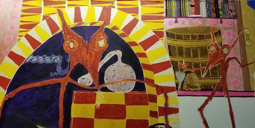 This painting was inspired by another painting that I did called TheWalk In. Walk Ins are people who when they die, souls transfer into a living person. Suddenly a person wakes up and finds that they can play a piano when they never have before, or suddenly they become a criminal. So, the figure, the alchemist, could be a walk in. He is my central character in many paintings. People interpret him as a lizard, devil, dog, skeleton etc. I see it as a persona. A figment of my imagination coming out to tell a story, because what is a picture, but a story? Alchemy has ties with mysticism and I am interested in both. Who doesn't like a good mystery? When I paint, I don't worry about anyone liking my work or even how it fits into society. It comes from a subconsciousness that somehow gathers the information that I observe/read and becomes a story.